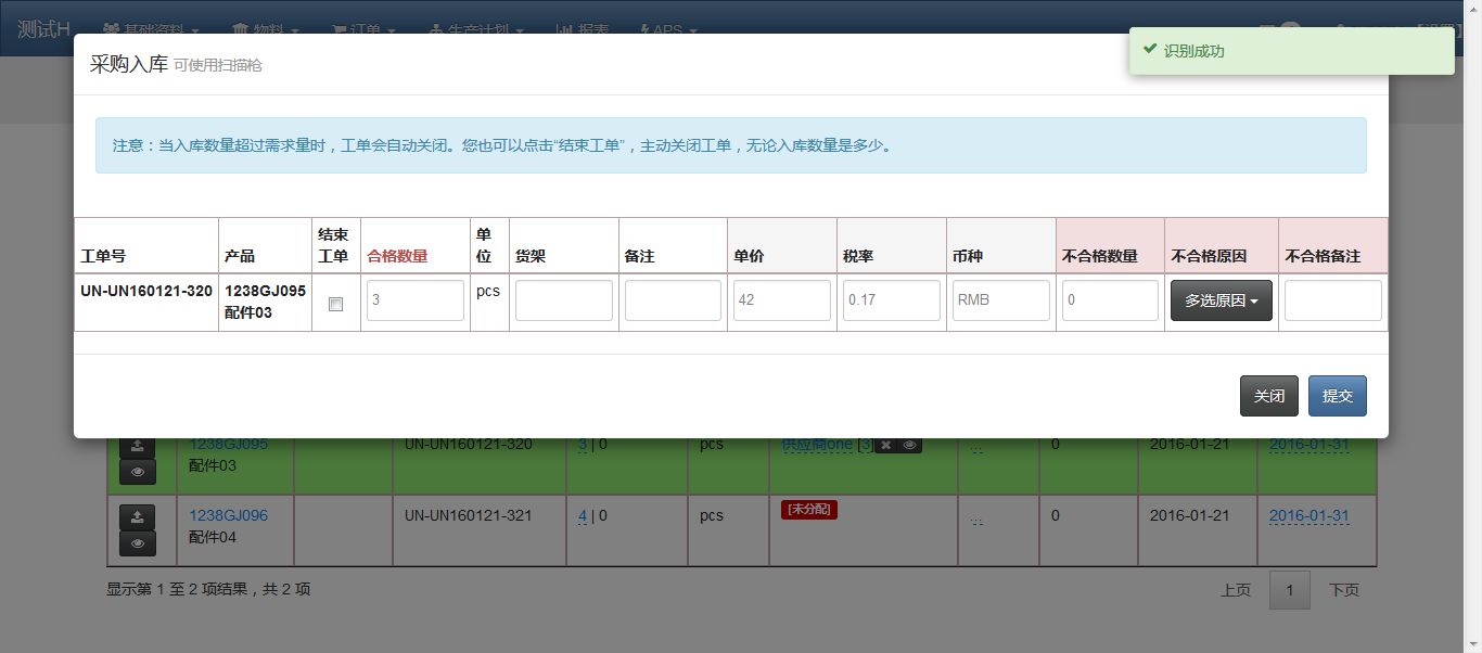 还是前面的案例,如果采购数量少于计划数量,但人为认定可以完成工单了。如上图,在“合格数量”左侧有个勾选框“结束工单”,当勾选它时,无论完成数量是否达到计划数量,该工单都会被强制结束。