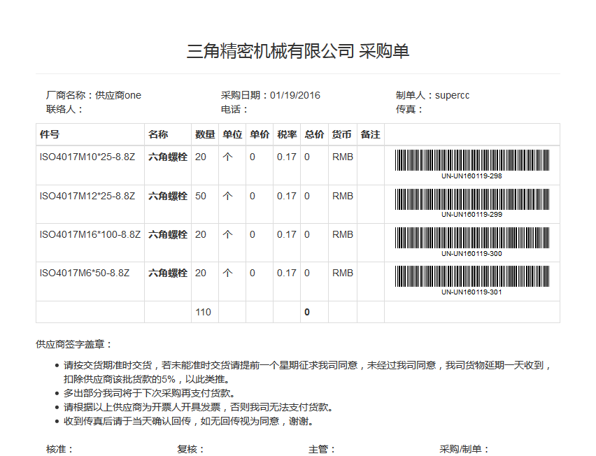 同样的,采购入库一定要凭单操作。单就是采购单或者送货单。采购单是由采购部生成的,也可以支持条码,当然条码不是必须的。下面是一张采购单的例子。