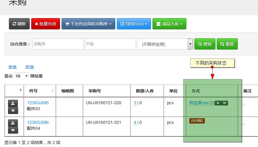 图中红色的“未分配”,意思是该采购计划还没有分配给某个供应商,即还没有向某个供应商采购,自然不会入库。但图中,如果显示了供应商的名字,即表示已经向此供应商采购了。