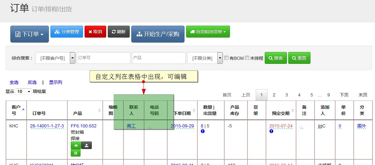 当定义了自定义字段后,订单页面就会多出几列出来。这些列可以在一些打印单据(比如合同,出货单等)里出现,也可以用于自定义搜索。