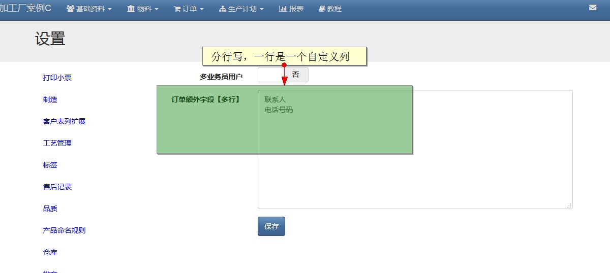 系统的订单表格支持自定义多列,以满足不同的客户需要。可以在“系统设置”中的“订单”标签内自定义多个列,如下: