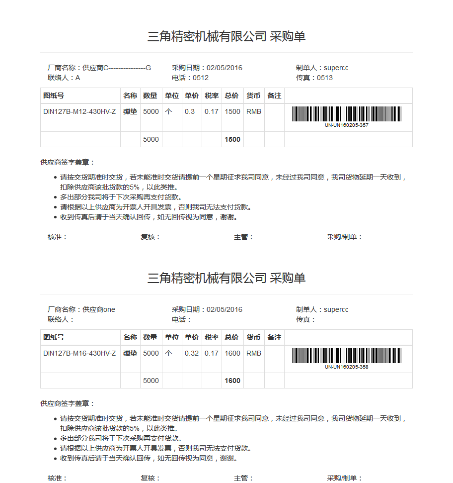 可以选择打印采购单,交给供应商。供应商在交货的时候带上采购单,仓管可以扫码入库。