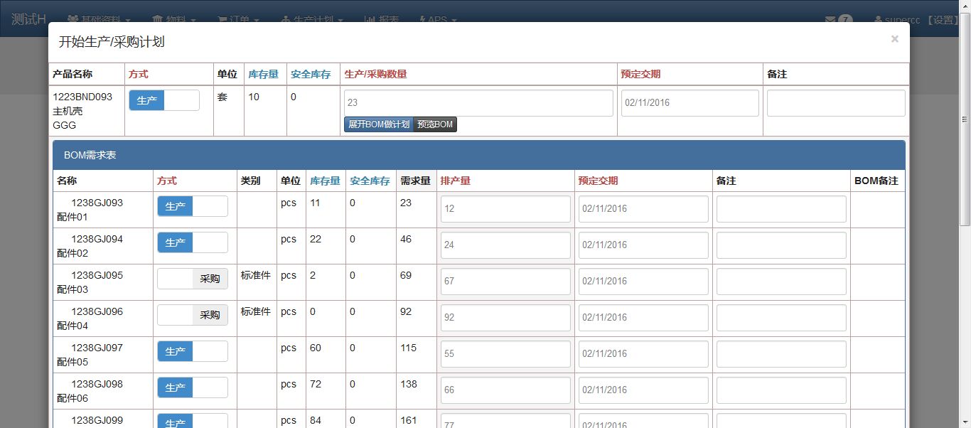 - 排产。根据BOM展开时,标准件类会提交请购。