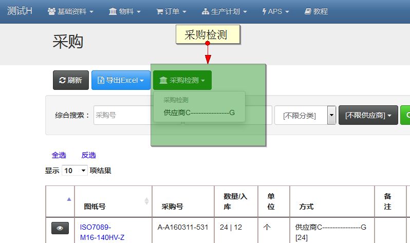 采购检测的方式和入库操作是一样的。只是如果把“强制入库检”功能打开的话。所有物料在入库前必须经过检测人员的确认才行。