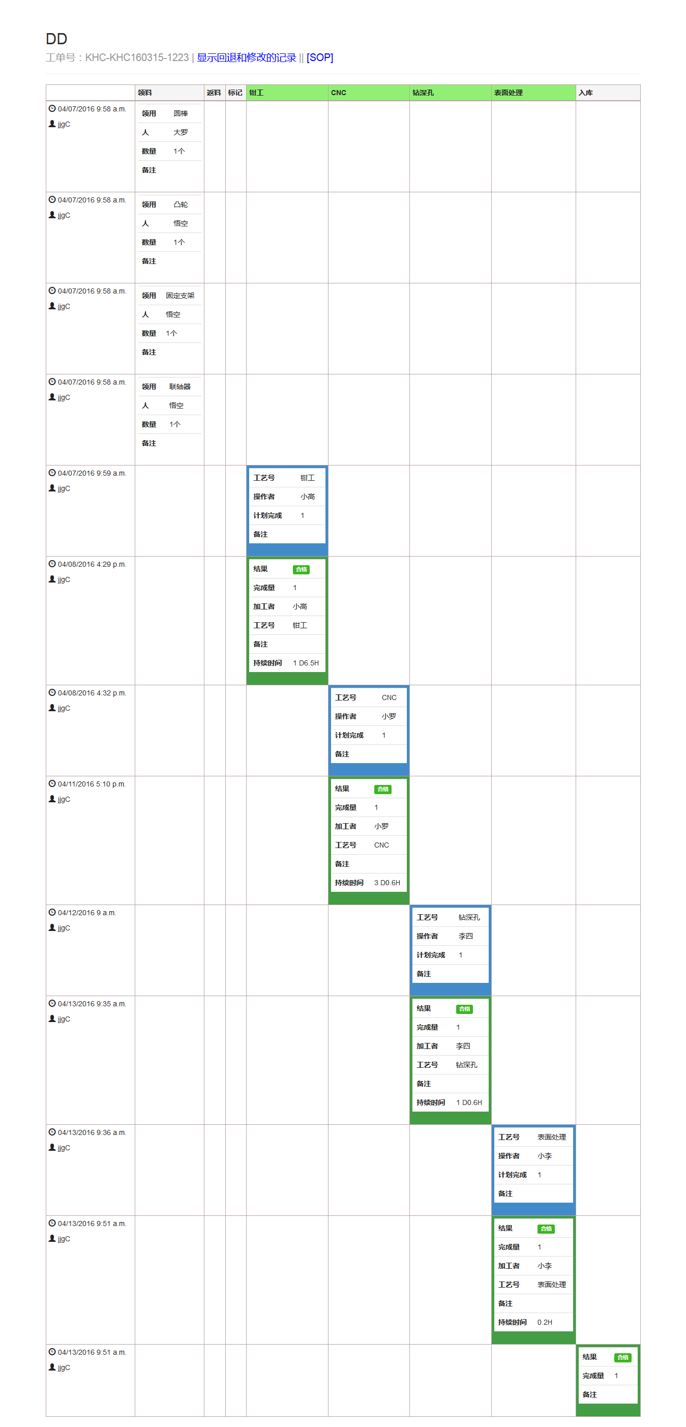 每个工序格会记录,比如加工人,数量,备注,时间,实际时间,工时等等信息。
