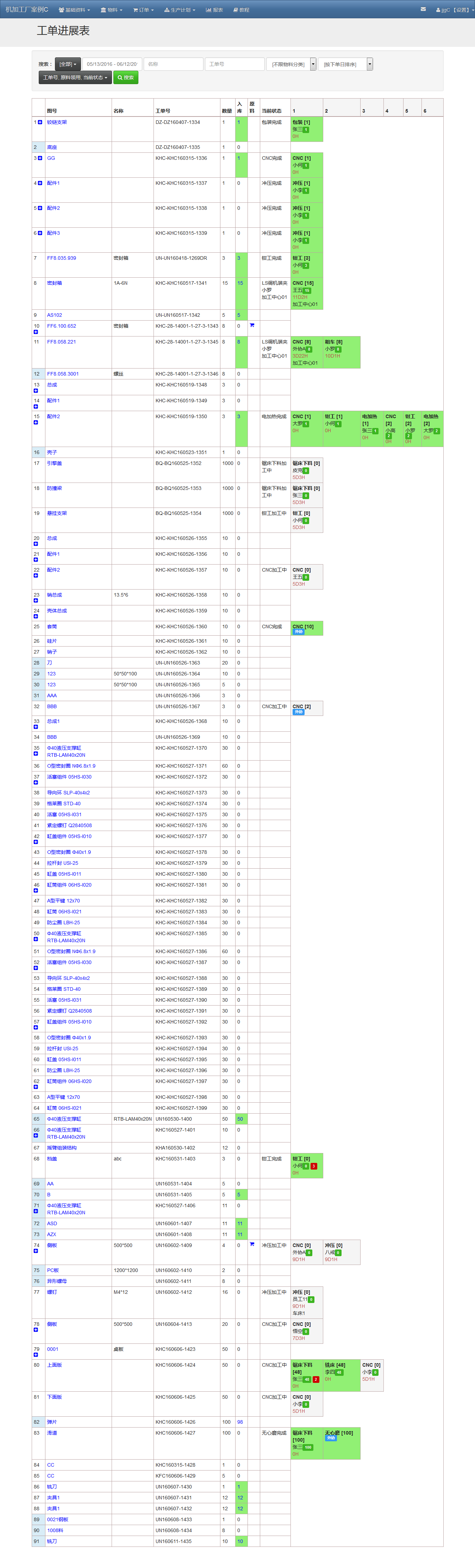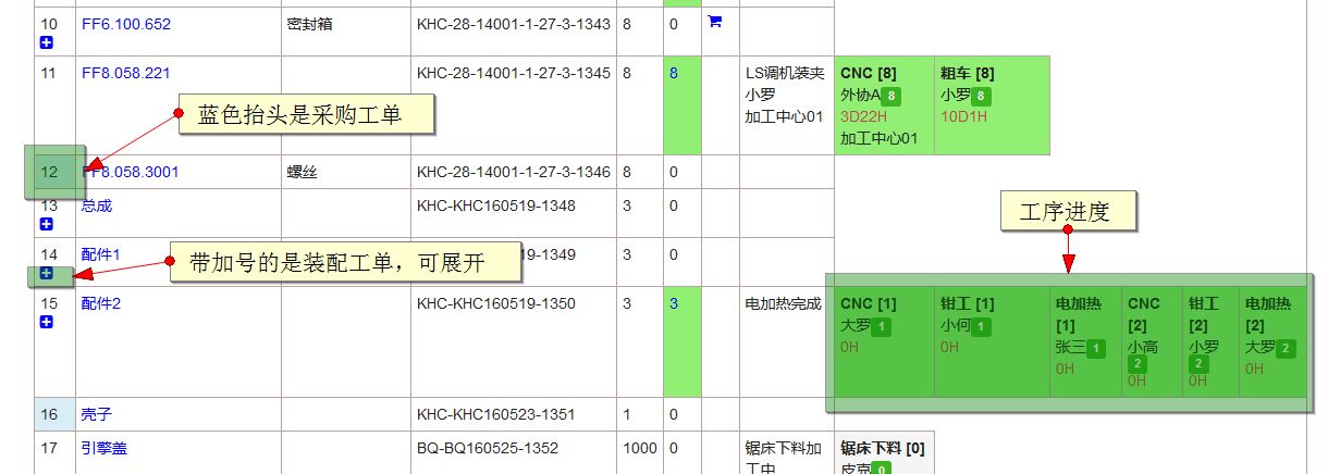 “工单进展表”每一条都是一个工单(有工单号可对应)。在系统内,生产和采购都是工单。他们在“工单进展表”内呈现方式不同,最典型的就是生产工单有工序进度。我们用下面的截图举例。