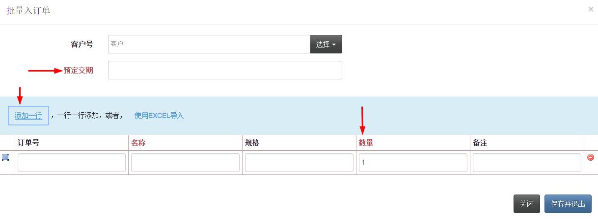 您的位置:首页 > 培训教程 > ERP/MES软件基础 V3如何下订单 来源:通商软件2016-09-042016-09-01 ERP系统 & MES 生产管理系统 10万用户实施案例,ERP 系统实现微信、销售、库存、生产、财务、人资、办公等一体化管理 立即注册免费体验 下订单 到生产管理表页面,点击execl下单,如下图 点击后会出现编辑页面,将订单信息输入,点击保存并退出,如下图,其中红色字体的是必填项 在线疑问仍未解决?专业顾问为您一对一讲解 24小时人工在线已服务6865位顾客5分钟内回复 马上咨询