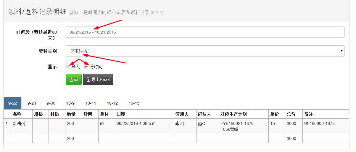 点击后会出现如下图的样子,查询的时候选择查询时间段,物料类别,报表内容可以分人或者分时间显示