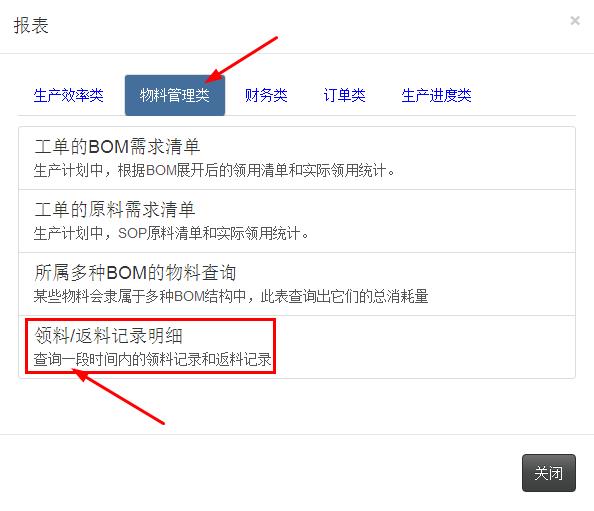 点击菜单“报表”,选择物料管理类,点击“领料/返料记录明细”,如下图