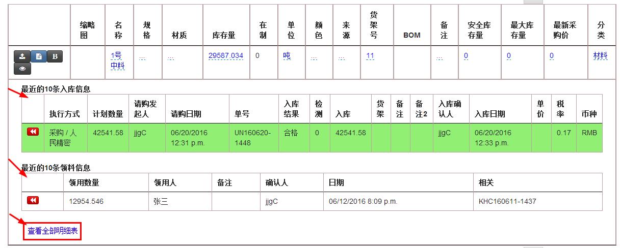如上图,搜索栏输入要查询的物料名称-点击搜索-下面表格中显示查到的物料信息,然后点击小眼睛的图标,会出现下图的信息,包括入库,领用信息