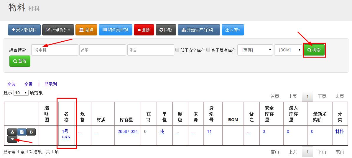 进入后,根据查询菜单搜索出要查询的物料名字,如下图