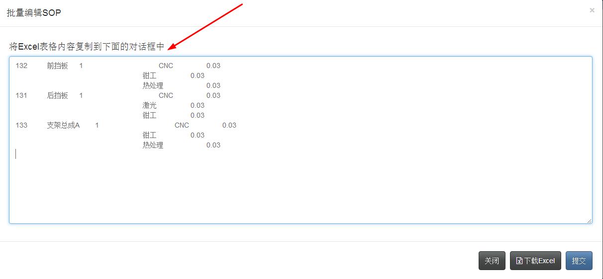 - 点击后会提示下载excel表的,打开下载好的excel表,如下图。注意,红色标题的内容不要修改,分别输入工序名称等内容后,将其复制,表格中的抬头不要复制