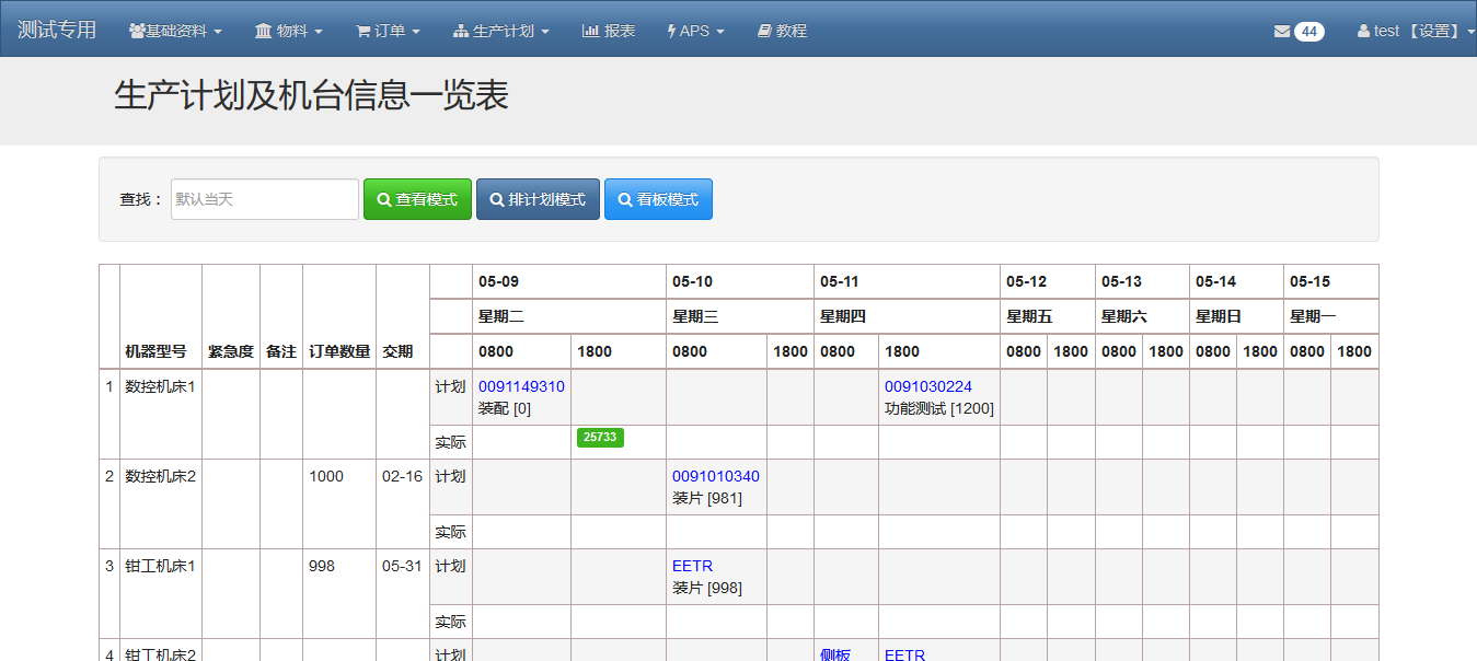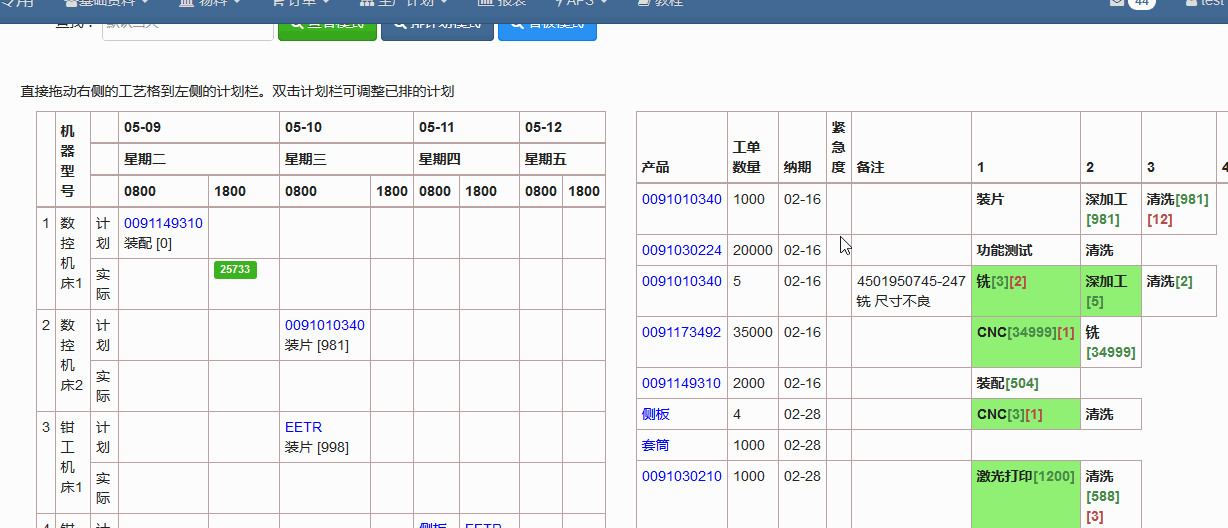 每个机台(横列)显示计划栏和实际栏,计划栏显示的是做好的计划,实际栏会抓取现场的报工结果,把完成数量,不良数量显示在上面。