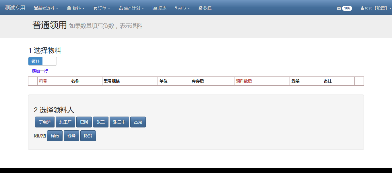 可以在普通领料和基于工单的领料页面操作,下面我们用普通领料来举例,如下