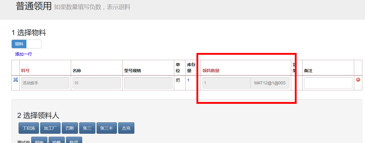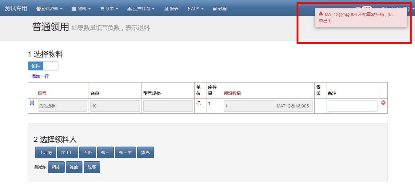 在这个页面之下,直接扫描二维码即可。注意在扫码之前,有个开关是“领料或者返料”(在第一步骤的下面)。因为系统会判断二维码是否重复领料(显然现实情况必须阻止)。如果一个物料被领用过了,重复扫码肯定要阻止,但如果是要退回,则不会被阻止。当开关切换到“返料”,它就不会被阻止。