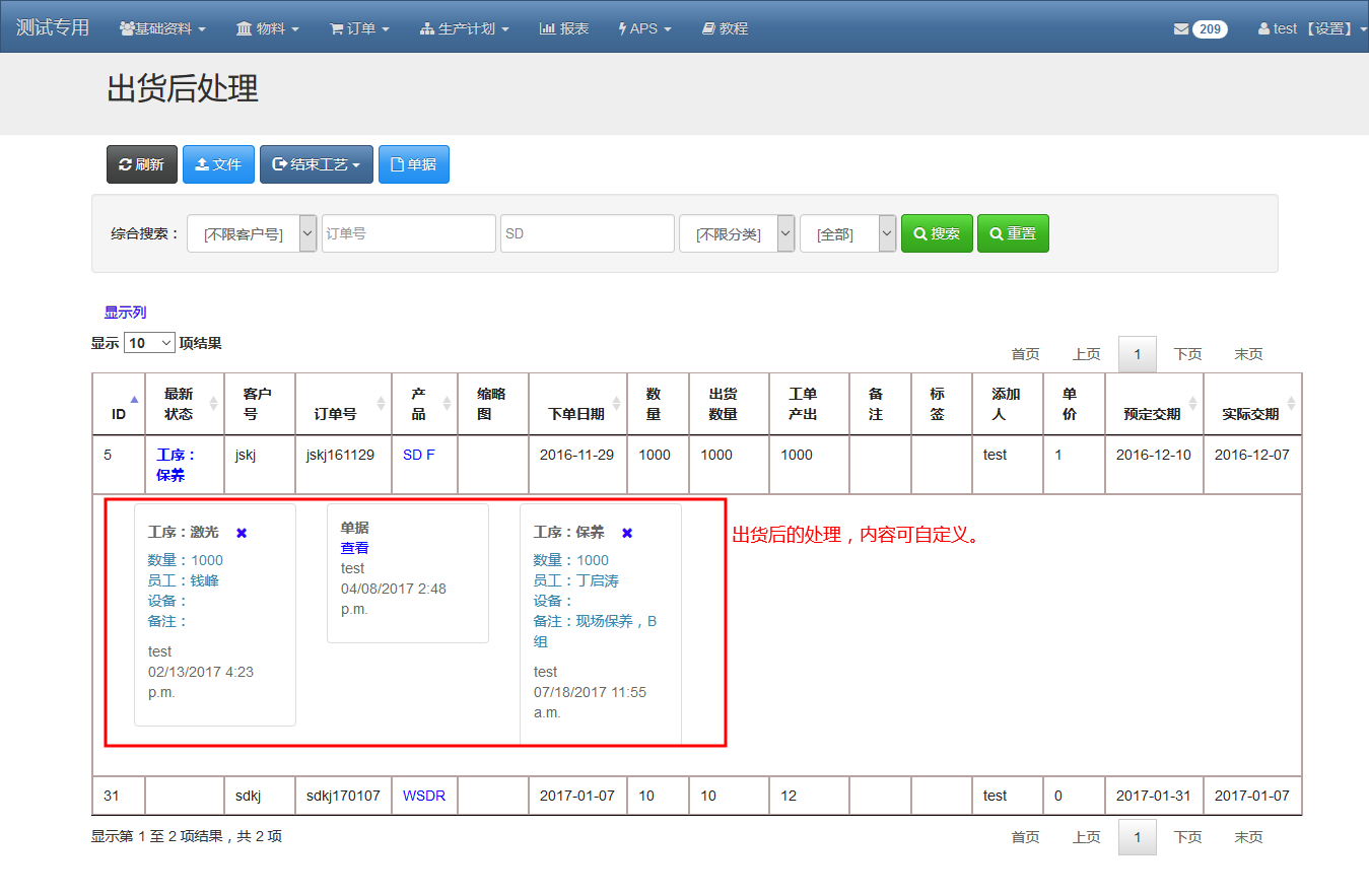 - 记录出货后的动作,包括开单据,现场安装,保养,维修等,内容可自定义。