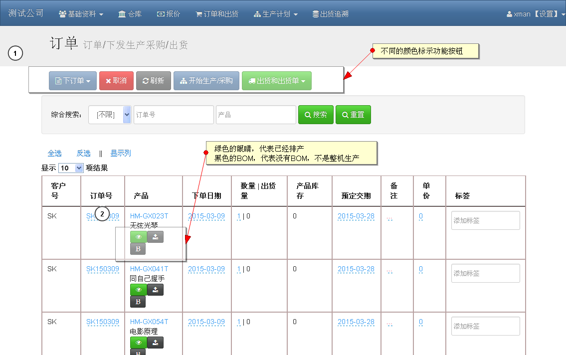 速易天工ERP系统的界面,大量使用颜色标示,而且具有统一性。对于常用的用户,有时候甚至不需要看字,就是能在一大批信息中找到想要的信息,从而提高其使用效率。我们以订单为例。
