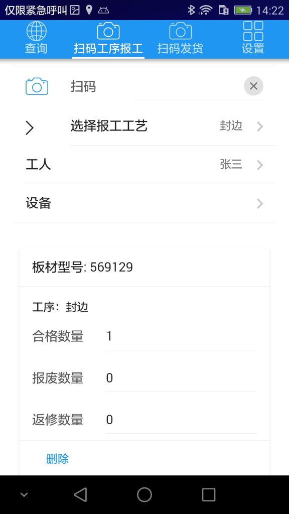 • 生产工序报工,包括工序的加工人,机台,数量,质量等,通过二维码扫码方式。