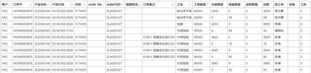 3、我们安装了速易天工V3统计功能+生产日报表+员工生产报表来解决员工绩效考核问题。在产管理表里有个统计-报工记录,这里记录所有报工记录,随时可以查询某个订单的所有记录,包括加工者、加工设备、工序、时间等都可以查到。
