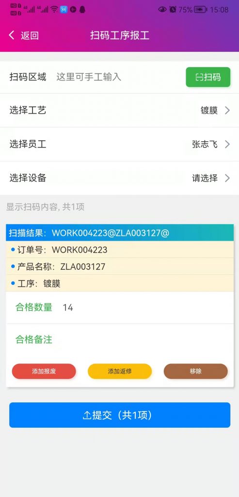 2、通过引入了速易天工V3在产管理功能+APP扫码报工。通过员工的手机,扫码系统自动生成二维码,读取生产订单信息,报工合格、报废、返修数量,提交到系统。实时显示在产管理表,管理层在电脑、手机、IPAD上可以直接查询加工进度,支持电子看板模式,放在会议室或者车间,这样客户和催单员就能实时查看进度,不再出现交付期延迟的情况。