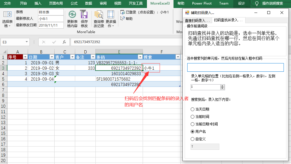 - 扫码后,会自动找到对应的条码信息,并在右边单元格录入用户名