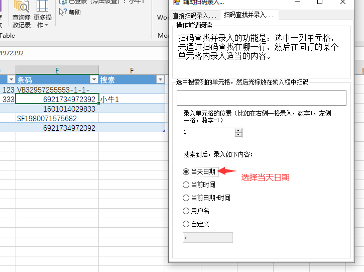 - 扫码后就会找到对应的条码,在右边单元格录入日期
