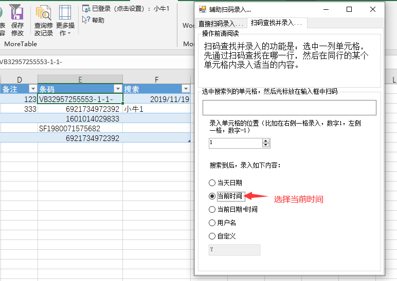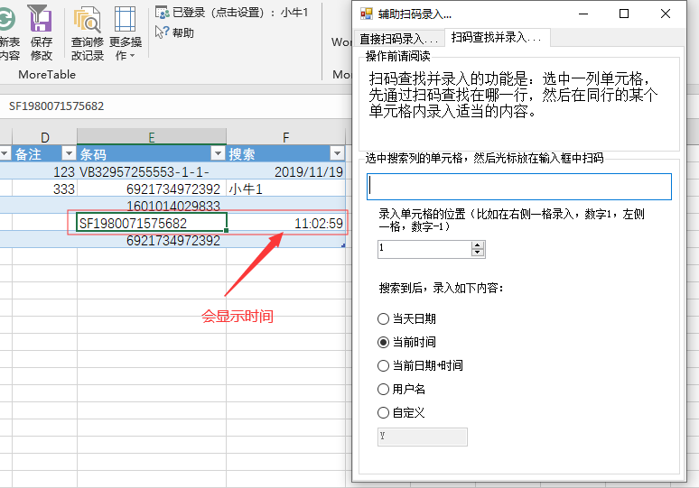 - 下面是“扫码查找并录入”,比如想显示录入条码的用户,时间之类的。可以这样操作,用扫码查找