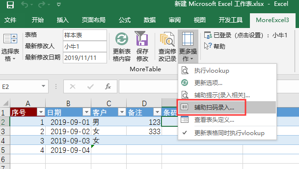 - 点击moreexcel3带单的更多操作-辅助扫码录入。在这个操作之前,您需要先登录。