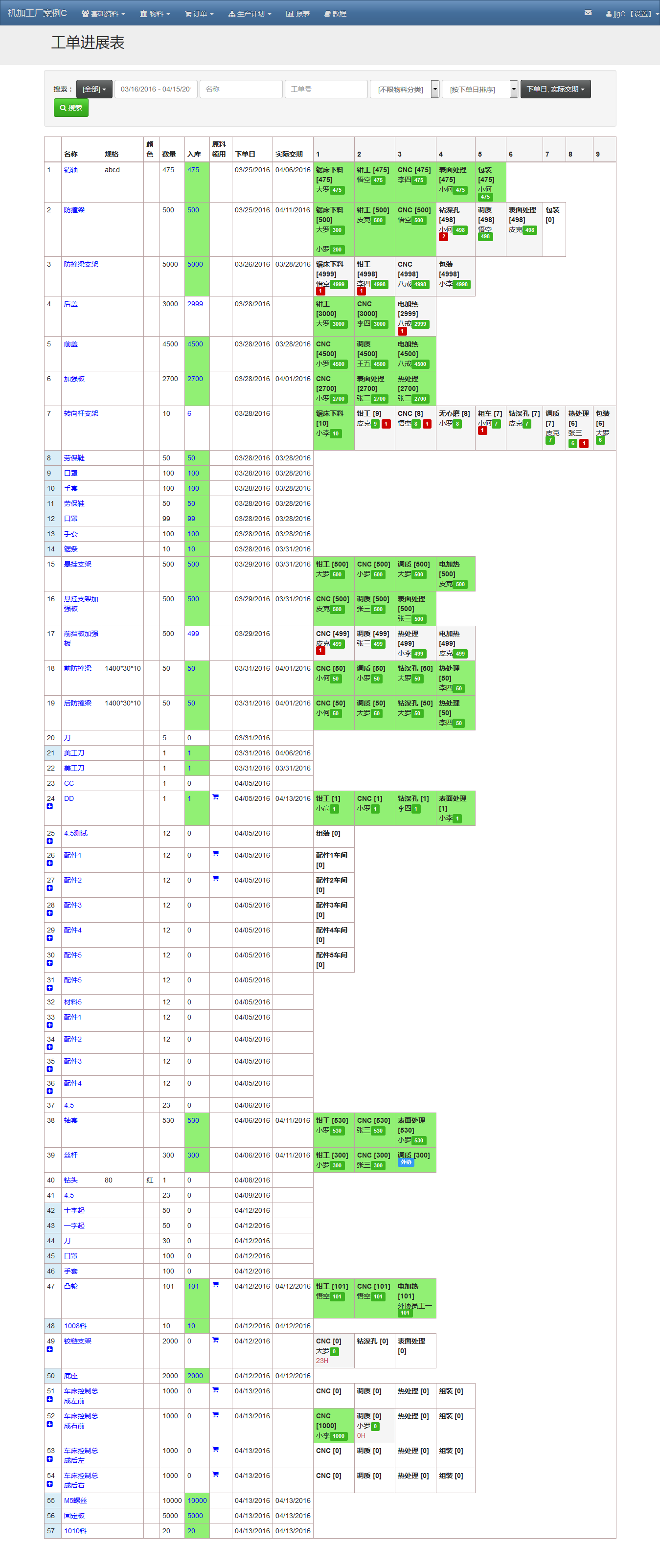 • 最右侧,是工艺进度的现实,绿色代表完成,灰色代表进行中,白色代表还未开始。同时还能显示加工人的名字,以及各自的完成数量(方框内的数字)。