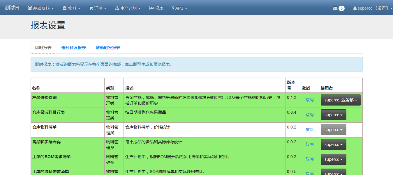 绿色表示激活,白色表示未激活。如果要让某个用户使用报表,需要: