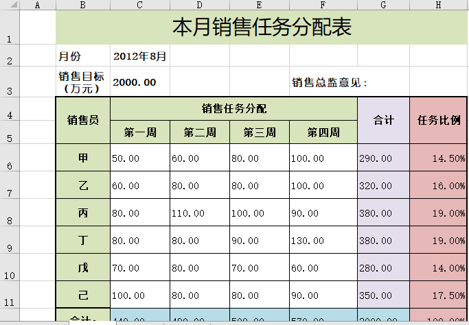 本月销售任务分配表