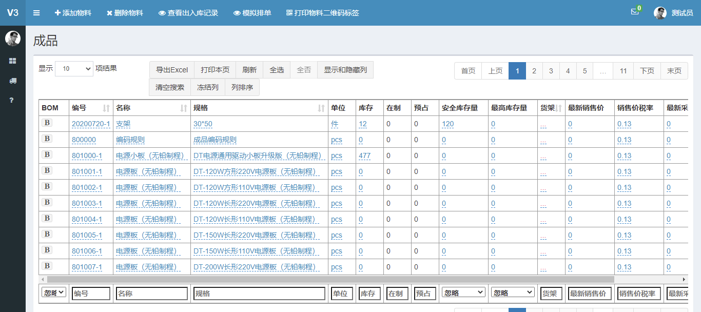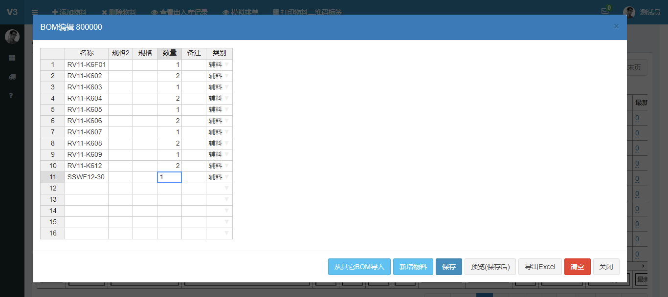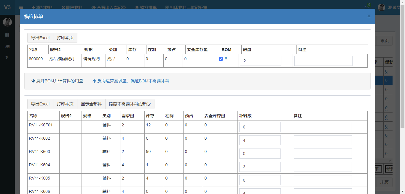 - 根据BOM来模拟排单,自动抓取库存,并计算缺料数量。