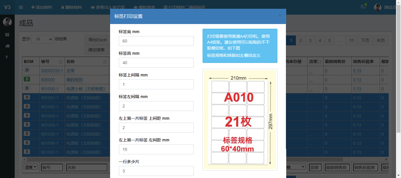 - 每个物料都可以导出二维码标签,可以接入普通打印机直接打印二维码标签。